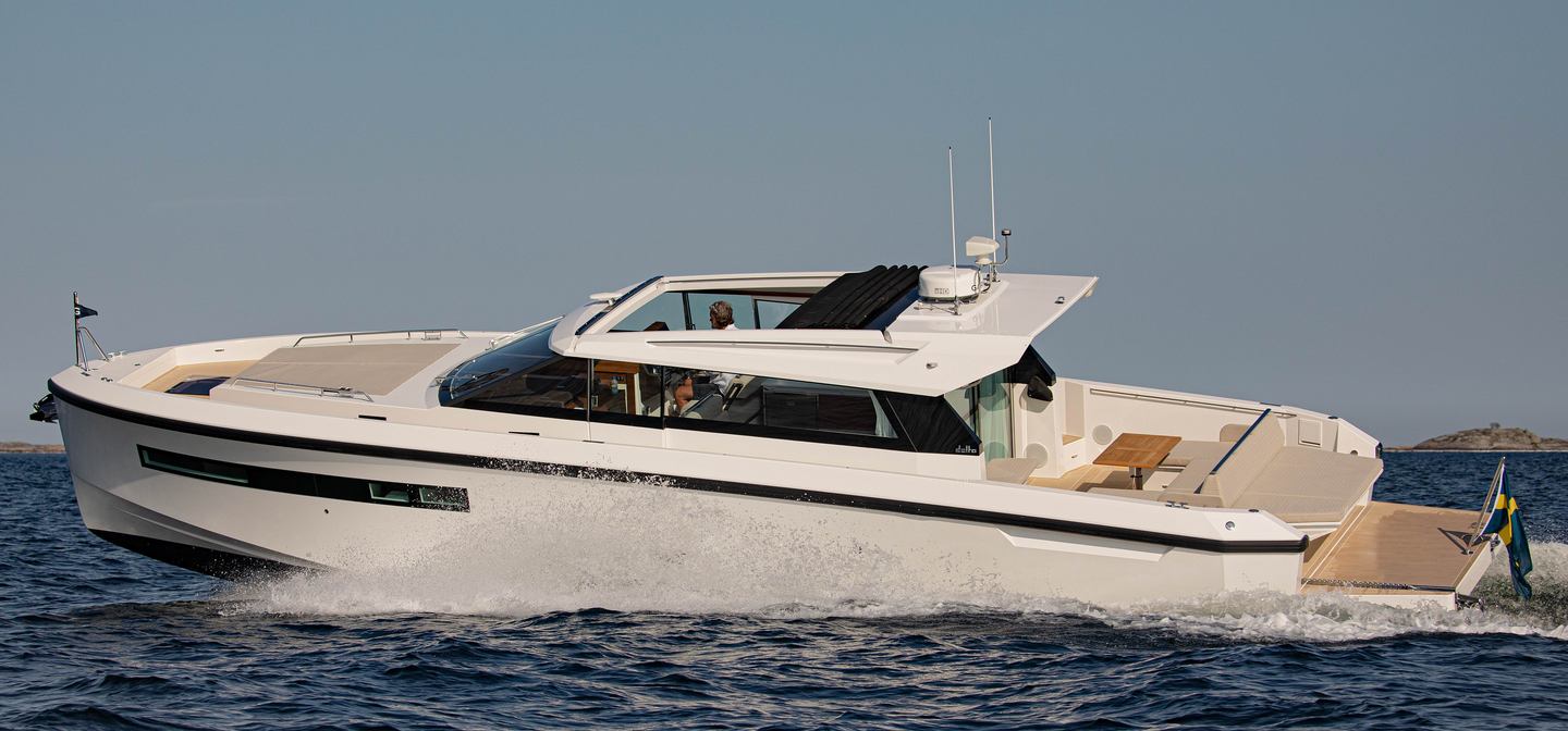 Ever since Delta Powerboats was introduced in Sweden two decades ago, our boats have been associated with visionary design concepts, efficient hydrodynamics and advanced technology integrations. Our latest release captures this spirit in a sleek, versatile and energy efficient sports cruiser made of carbon fiber. Being the latest result of the partnership with Mannerfelt Design, the Delta 48 combines and elevates features from our previous Open and Coupé models. Generous deck arrangements allow guests to enjoy multiple exterior lounges and sun beds or seek shelter within an enclosed saloon with unobstructed visibility. Sliding aft- and side doors blur the boundaries between the inner and outer decks and thanks to the large electrical sun roof the 48 easily adapts to changing weather. Below deck the handcrafted interior accomodates six guests across three cabins where the owner occupies a forward master stateroom with generous storage and en suite bathroom.