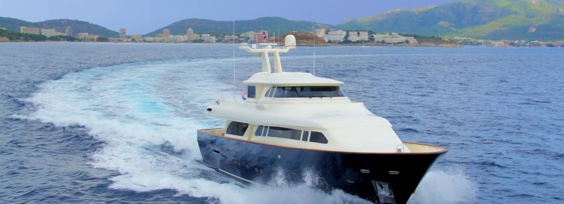 Powered by twin diesel MAN (D2842LE406 V-12) 1,200hp engines, motor yacht Myeraah is capable of reaching a top speed of 18 knots, and comfortably cruises at 16 knots. With her 3,963 gallon fuel tanks she has a maximum range of 1,200 nautical miles. Her semi-displacement hull design means she offers a great balance of space and speed.