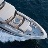 Palm Beach PB85 Sedan makes its world premiere as the largest new model at this year’s show. Delivered earlier in 2025, the 28-meter yacht Falcon represents the line, showcasing Palm Beach’s craftsmanship and signature low-profile styling. The PB85’s open-plan saloon flows directly to the aft cockpit, forming a unified social hub, while below deck three to five cabins accommodate up to six guests. Built in GRP for speed and efficiency, the Palm Beach yacht cruises at 23 knots and tops out at 26.