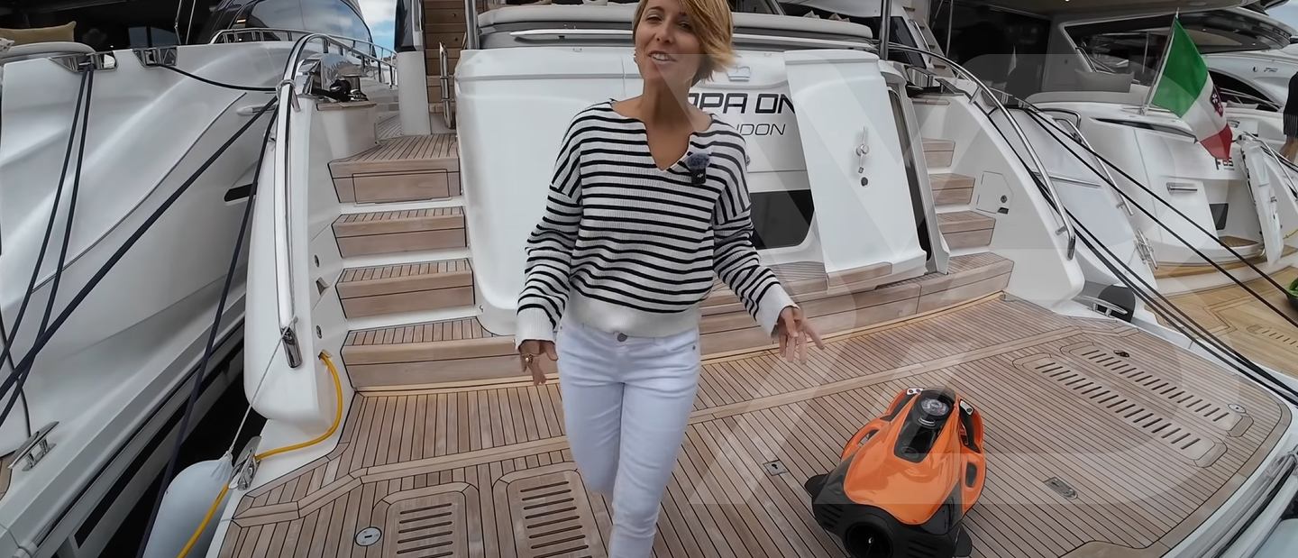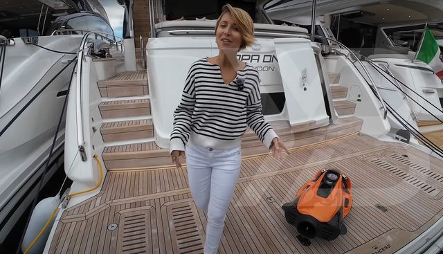 The hydraulic swim platform sets the tone right away. It is wide, drops cleanly for tender launch, and the chock receptacles are already in place. A long stainless rail runs the edge so you can tie fenders or grab on when the platform is lowered and everyone is in the water. The recessed swim ladder hides neatly to starboard. From here, stairs on both sides take you up into a cockpit that feels big for a 72, and it is full of tidy details that make day-to-day use easy. A fixed transom bench is built in so it still works even when the platform is down, which means some people can hang out up here while others are swimming. Shore power one and two live in a clean locker on port with cable exit slots so the doors stay shut, and the passerelle socket is right at hand. To starboard there is a transom shower plus shore water hookup and a deck wash outlet combined into one panel. The cleats are chunky, the capstan looks overspec in a good way, and the deck runs flush with a drain channel so water actually goes somewhere. On this walkaround it was blowing 30-40 knots and the cockpit instantly felt warmer and more sheltered.