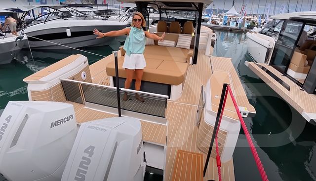 The outboards are the headline aft with brand new Mercury 425s on this hull, with the model range rated for 2 x V8 or V10 up to 850hp total. The swim platforms are broad and easy to move around - very usable on a twin-outboard setup, and not the usual narrow ledges you have to tiptoe along. There’s a boarding grab rail on the outboard side and fresh flexiteek laid along both quarters, it looks upscale and also saves the gelcoat when bags or gear bump the corners.