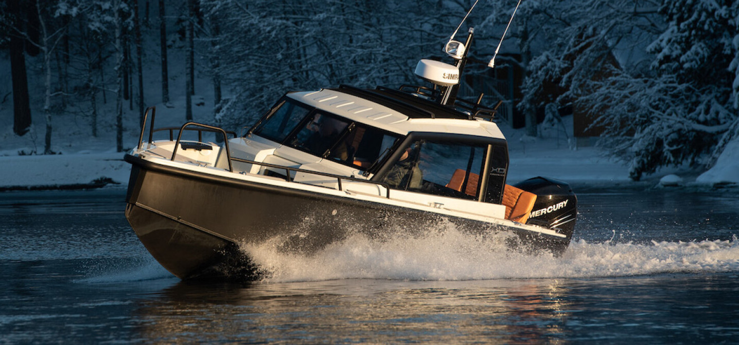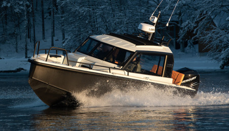The DFNDR 8 is built in Finland by XO Boats making full use of their in-house design team's expertise. The 8.03m/26'4" crossover boat constructed in aluminium can sleep up to two guests its cabin. Currently, available with a range of outboard engine options.