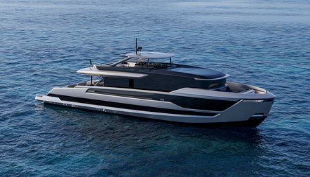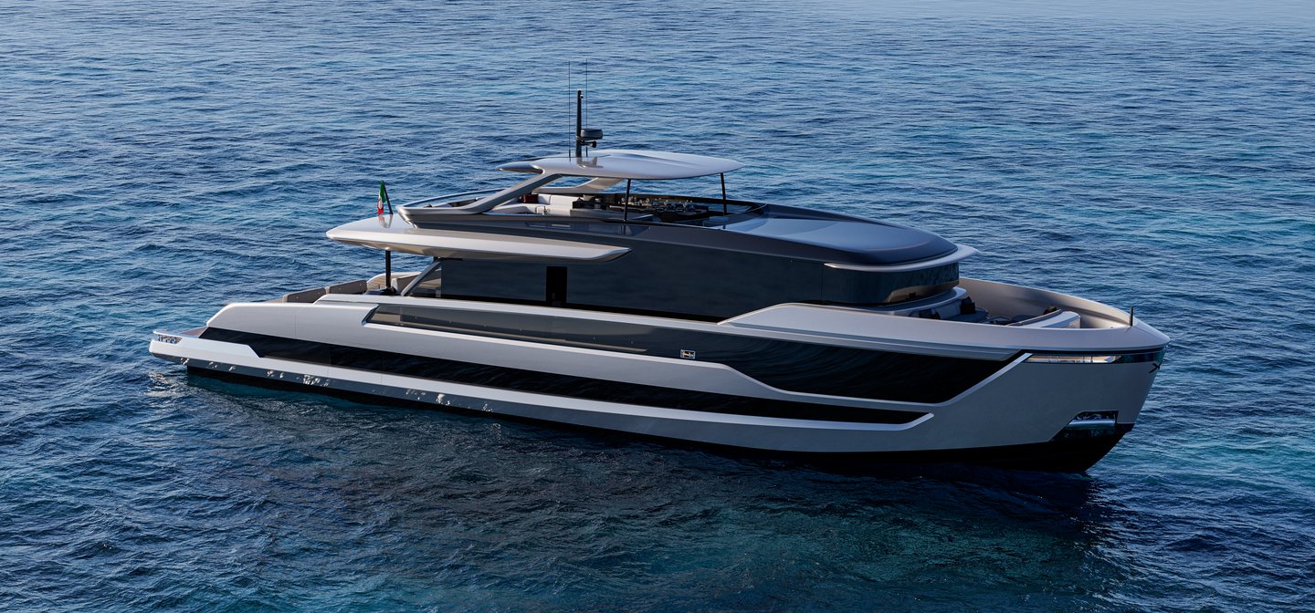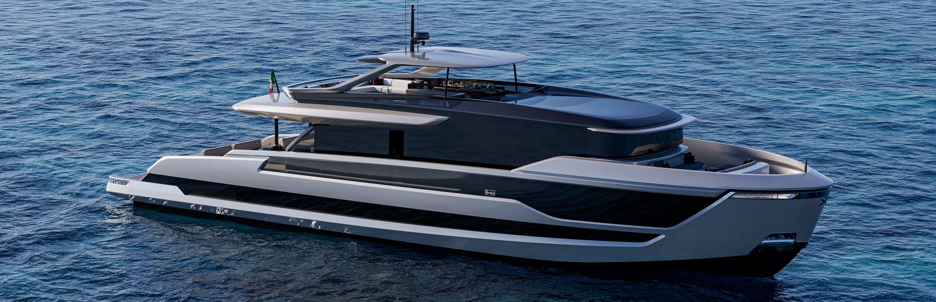 A groundbreaking architecture: volumes pushed forward, a sleek silhouette that glides over the waves, and an 85-square-meter aft deck unfolding across three levels. This is where poetry meets power.