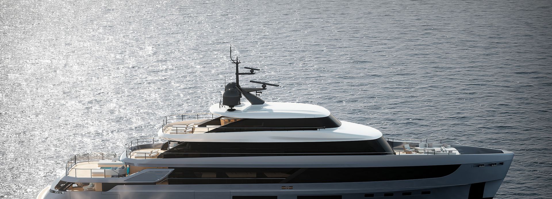 Designed around a displacement GRP hull and a carbon fibre superstructure she features a 8.67m beam and a 2.05m draft. The yacht is built over 4 decks with an internal volume of 430 GT (Gross Tonnes).