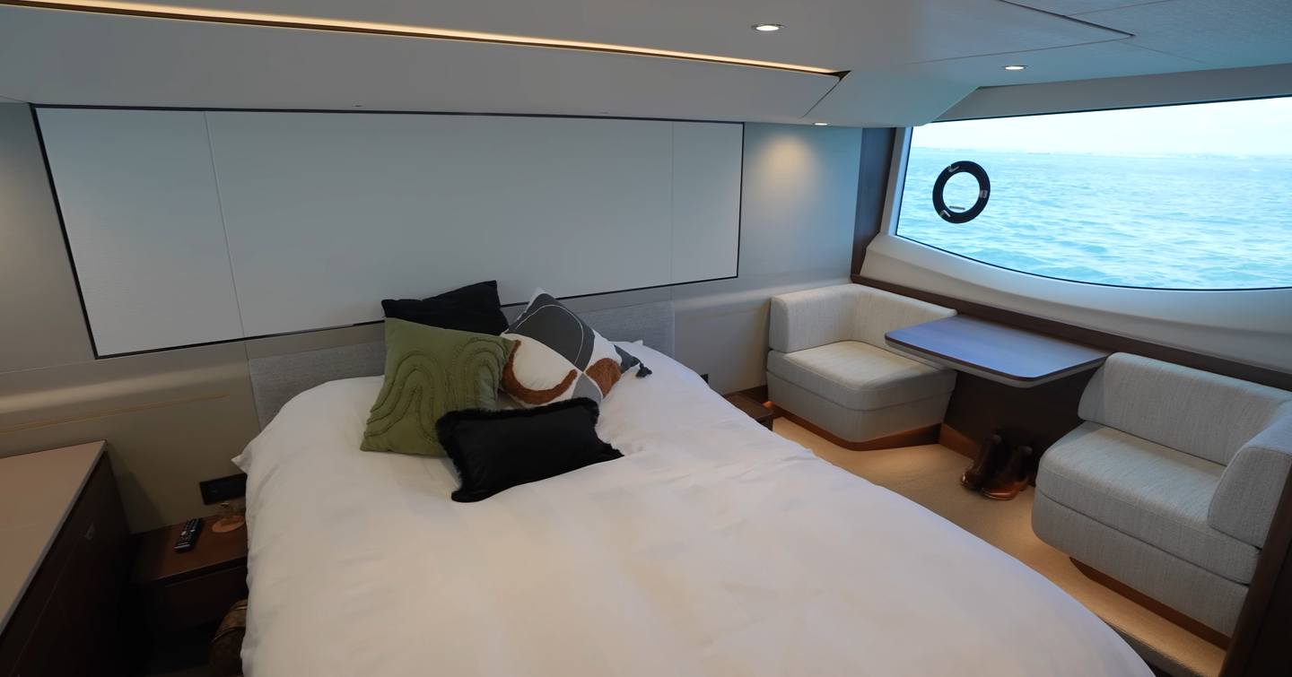Below deck, the full-beam owner’s cabin marks a clear step forward in both space and finish. “This is where the magic happens,” Henry said, describing the increased volume compared to his previous boat.