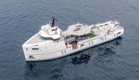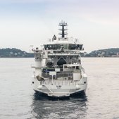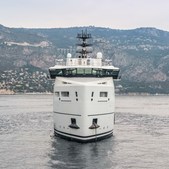 Originally built as an offshore support platform, she was converted by Damen Yachting with exterior styling by Azure Yacht Design into a hybrid role of utility yacht and support vessel. Her profile remains purposeful, defined by a recessed aft deck, forward helipad, and heavy-duty crane for tenders and chase boats. Onboard, she accommodates eight guests in four suites alongside a crew of 26, underscoring her operational scope.