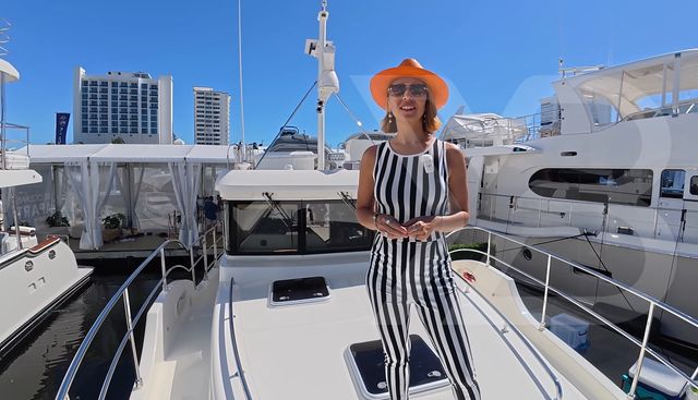 The foredeck offers open space for loose sun pads or bean bags. You could cover most of it with cushions while leaving cutouts for the hatches. The folding mast drops to about 3.7 m (12 ft) for Great Loop bridge clearances. Ground tackle includes a central stainless Ultra anchor with chain windlass, foot switches, and a deep chain locker. Starboard boards carry hooks for spare dock lines.