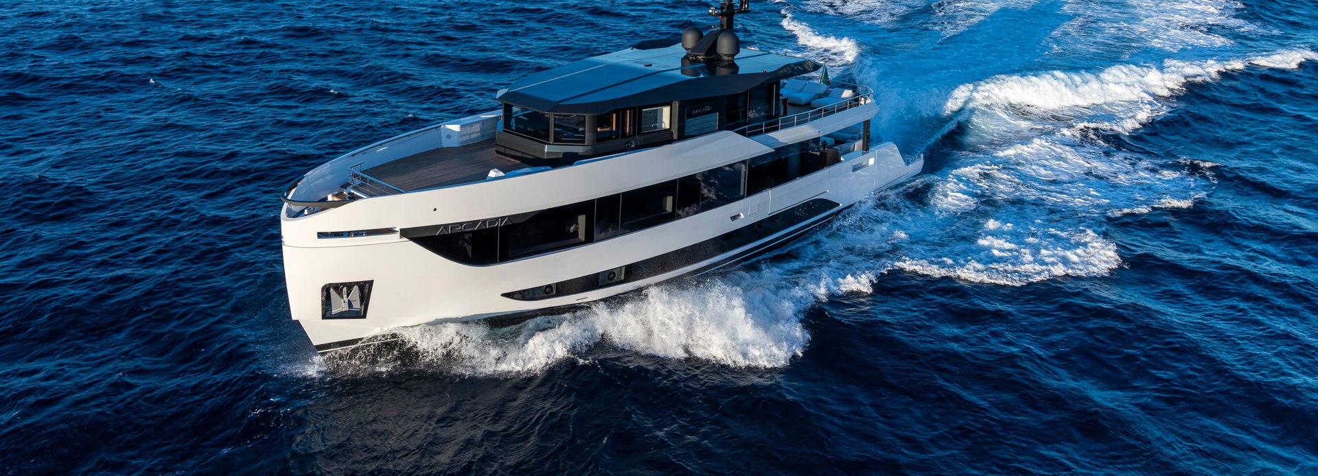 Powered by 4 x diesel Volvo Penta (IPS 1350) 1,350hp engines, motor yacht Arcadia A96/05 is capable of reaching a top speed of 23 knots, and comfortably cruises at 19 knots. With her 12,700 litre fuel tanks she has a maximum range of 2,000 nautical miles at an economic speed of 10 knots. Her planing hull design means she is fast and efficient as she slices through the water.