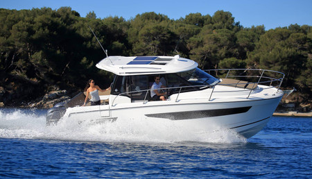 The Merry Fisher 895 was built in France by Jeanneau. The 8.9m/29'2" sports cruiser boat constructed in GRP can sleep up to six guests across two cabins. She was available with only one option for outboard engines.
