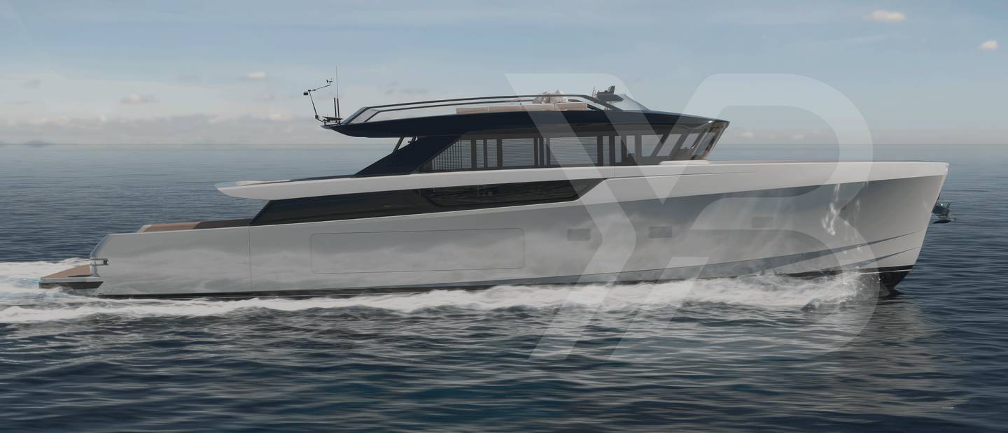 The shape here follows the same idea. There’s a sharp entry up front, a flatter run aft, and four reversed strakes that help lift the hull and soften the ride. It's designed to plane early, track well, and remain level when pushed. Built in GRP, it draws 1.8m (5ft 11in) and displaces around 72 tonnes at full load.