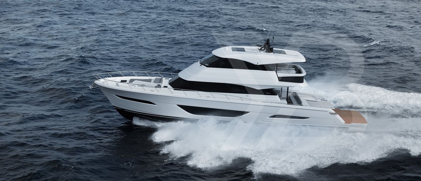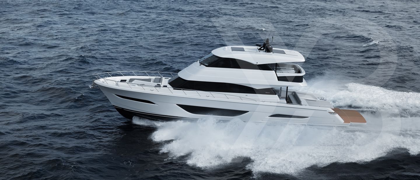 The Riviera 78 Enclosed Bridgedeck sits closest to the Maritimo in philosophy. It’s also Australian, also has an enclosed bridge, and is designed for owner operation or a small crew. Accommodation runs to a full-beam owner’s cabin, three further guest cabins and crew space aft. Performance comes from MAN V12s with a top speed around 30 knots and a 22–24 knot cruise, so in terms of pace it’s right there with the M75. The difference lies in the detail: Riviera leans harder into luxury styling and varied layouts, with more emphasis on soft furnishings and glamour.