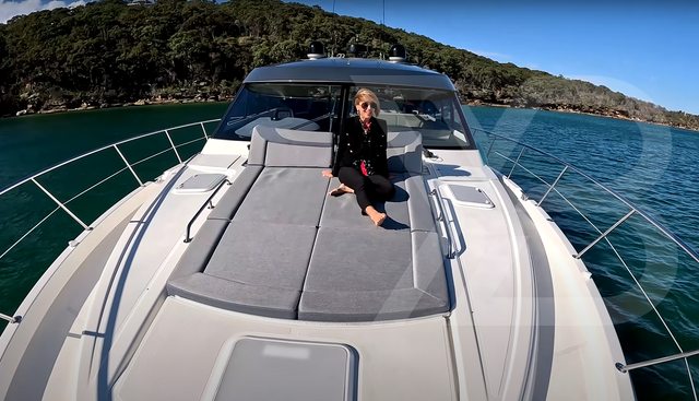 The bow has a long sunpad with adjustable backs, draining lockers with cup holders and a Fusion remote, plus proper access to chain and rollers. Safety hook for the anchor, windlass gear to starboard, and line storage to port. Fender racks above the chain locker, searchlight mounted forward, and chafe guards everywhere.